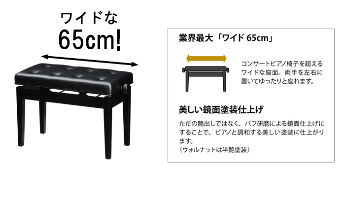 ■通常のピアノ椅子が幅55cm程なのに対して、Largo(ラルゴ)はなんと幅65cm! 余裕をもって演奏することができます。