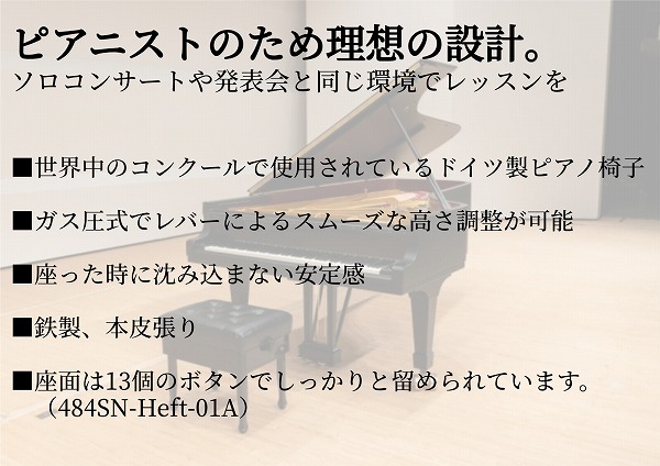 おすすめポイント@Andexingerコンサートピアノ椅子は世界のコンサート会場でも使用されているピアノ椅子です。高級感がありとても安定したピアノ椅子です。 ピアノ椅子の座面は通常幅が55センチ程度ですが484SN-Heft-01A/484SN-01Aは幅が65センチと広く設計されています。ゆとりを持ってピアノ演奏を楽しむことができます♪484SN-Heft-01Aの座面は13個のボタンでしっかり止めてあります。